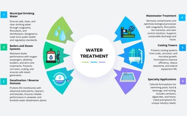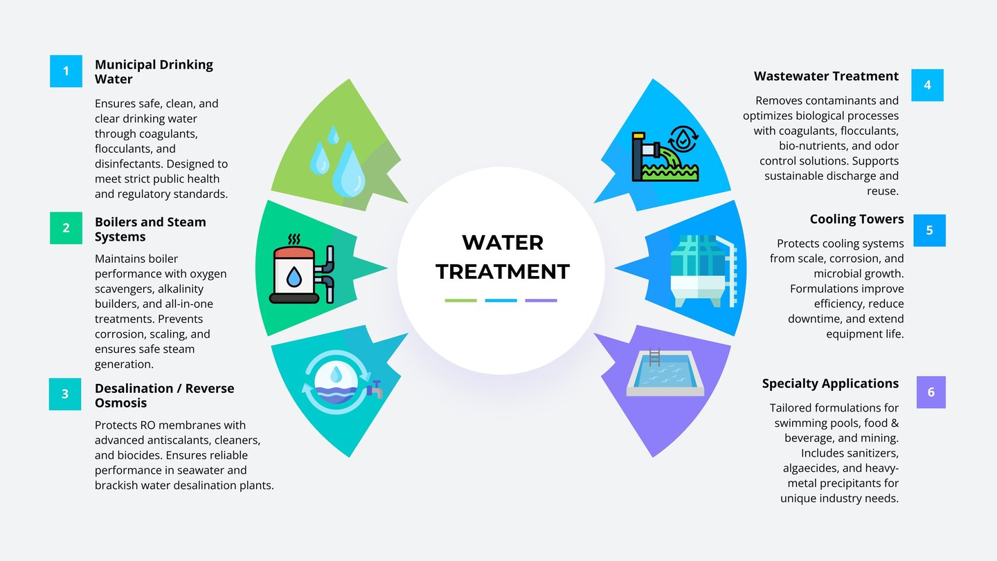 Water treatment solutions developed through precise chemical formulation, integrating corrosion resistance, scale prevention, and biofouling control.